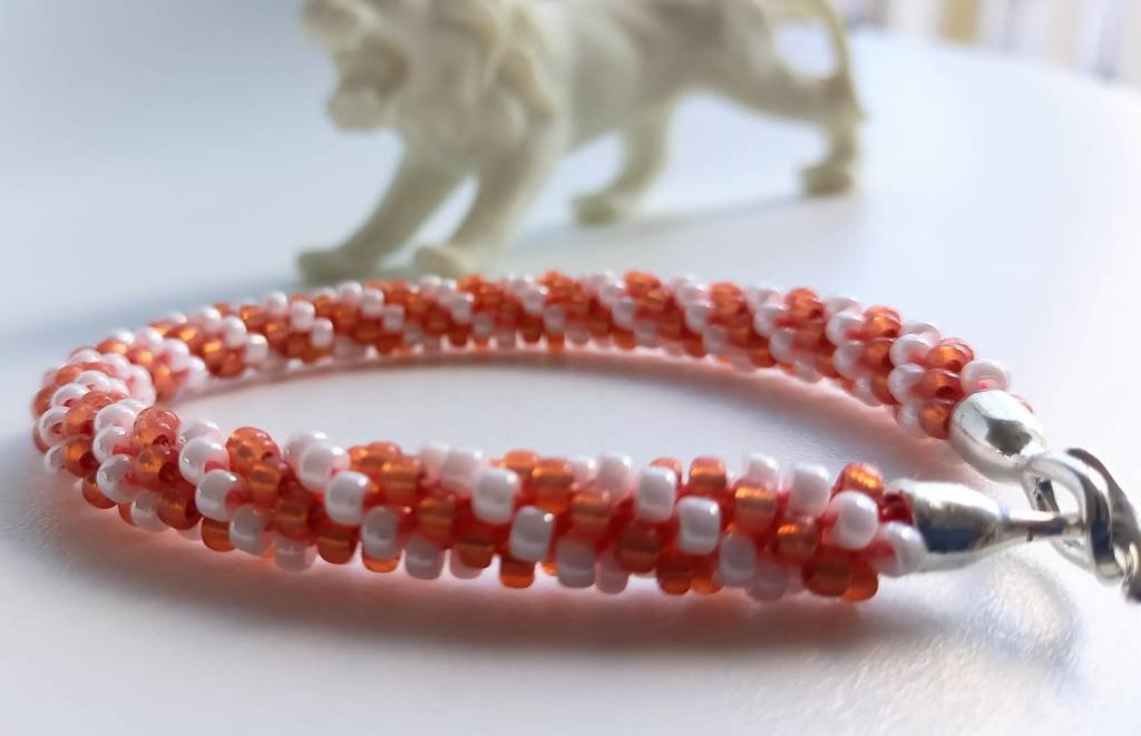 Handmade Coral and White Beaded Kumihimo Bracelet.